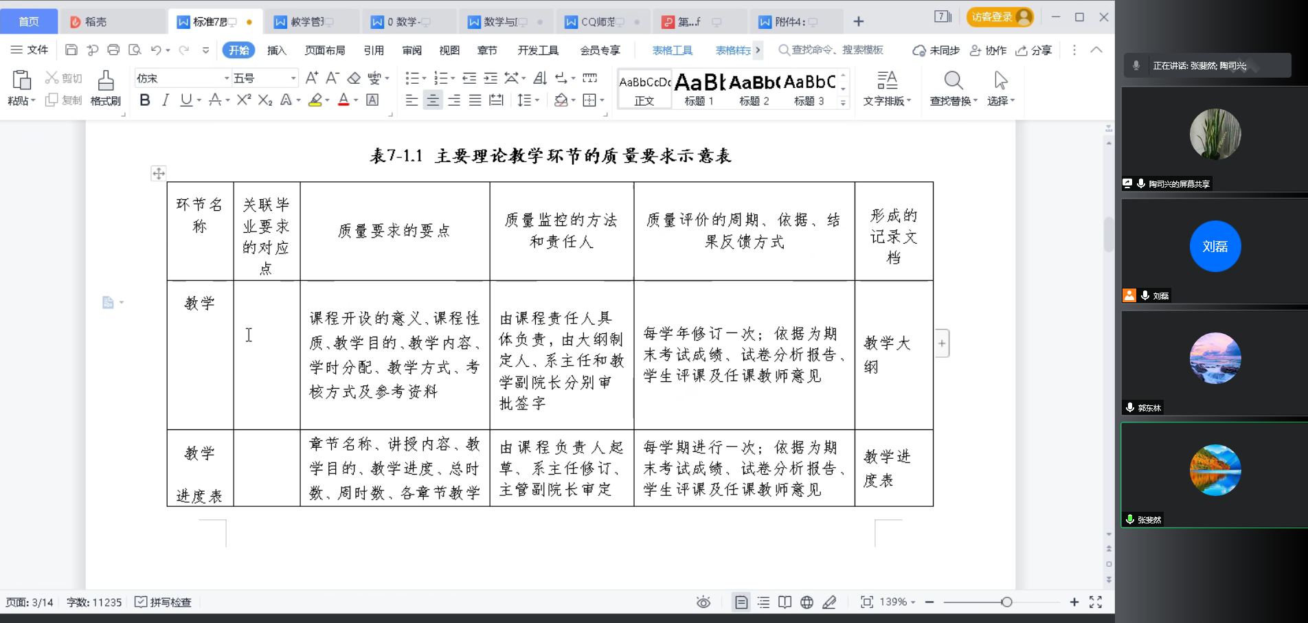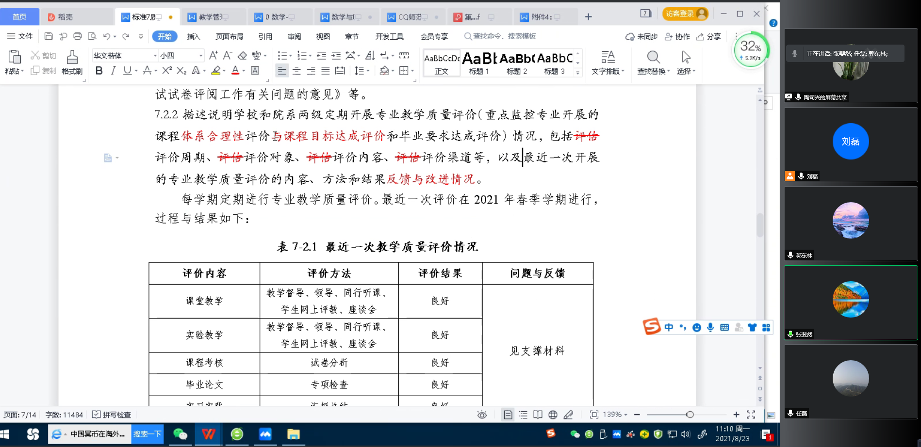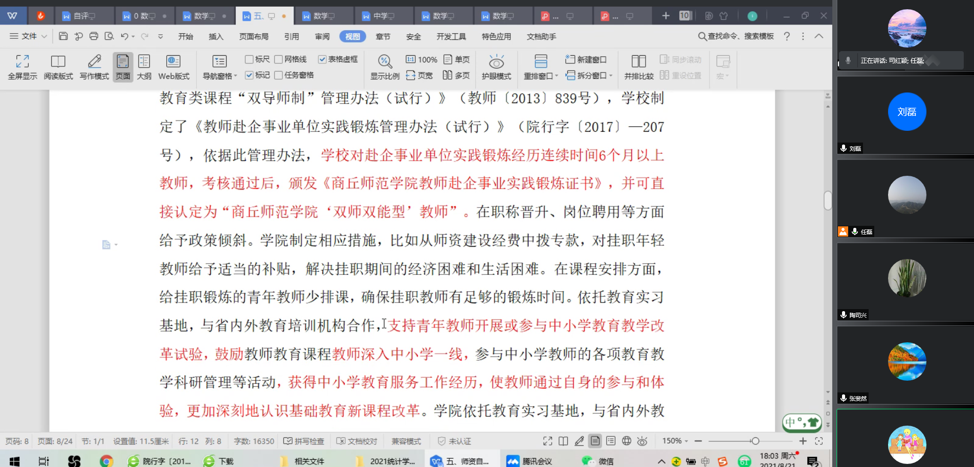 扎实推进“数学与应用数学”师范专业认证工作,做好认证自评和认证准备,8月18日至24日,beat365英国官网网站院长张斐然、副院长刘磊、各教研室主任、撰写小组成员、材料组成员借助腾讯会议线上持续进行了师范专业认证自评报告的审核、修改工作。