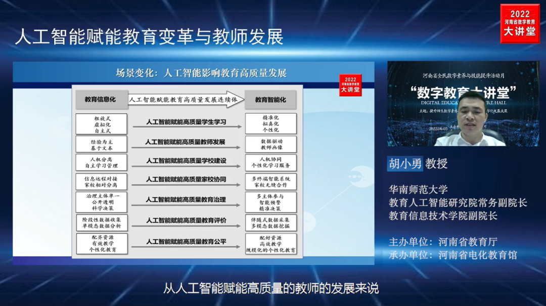 讲座分“教师数字素养提升与区域智慧教育发展”、“数字时代的教育安全形势”、“人工智能赋能教育变革与教师发展”三大板块进行。授课过程中,胡小勇教授强调,数字化转型、智能化升级是当前国家教育改革创新的重要方向,在此背景下,人工智能将为教育高质量发展带来新契机,为教师的智能教育素养带来机遇与挑战。