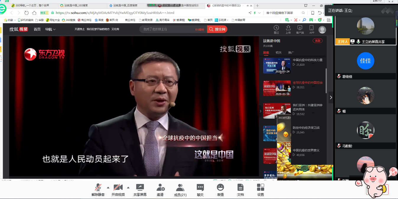 随后,全体党员一同观看了复旦大学中国研究院院长张维为《这就是中国》中的《全球抗疫中中国的担当》。这次的新冠肺炎疫情让更多人清楚地意识到,病毒面前没有国界,面对疫情,任何一个国家都难以独善其身。在疫情防控过程中,我们更进一步体会到中国共产党的集中统一领导和中国特色社会主义制度的优越性,感受共产党员在疫情防控战役中的模范带头作用,通过疫情期间发生的一个个案例,让学生党员们看到中国共产党带领的中国人民在战“疫”中所展现出的中国速度、中国效率、中国力量、中国精神。