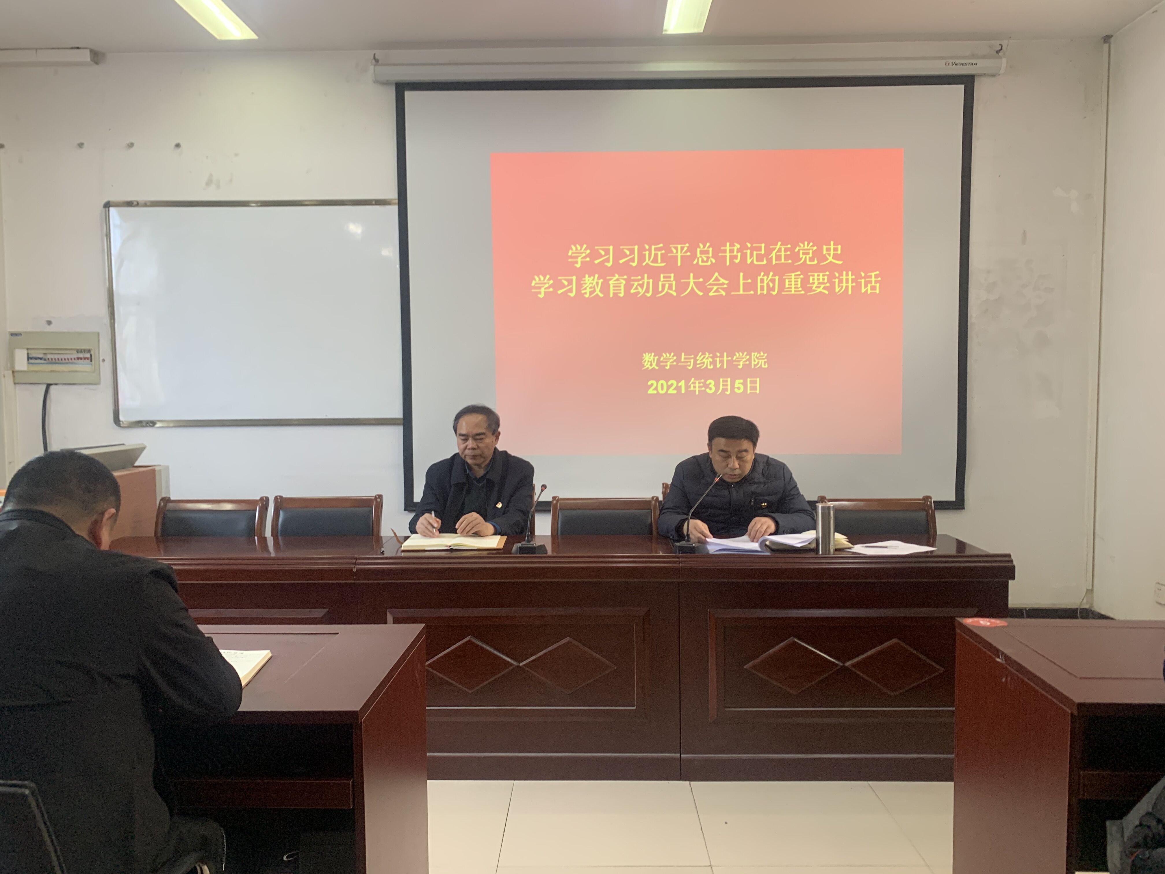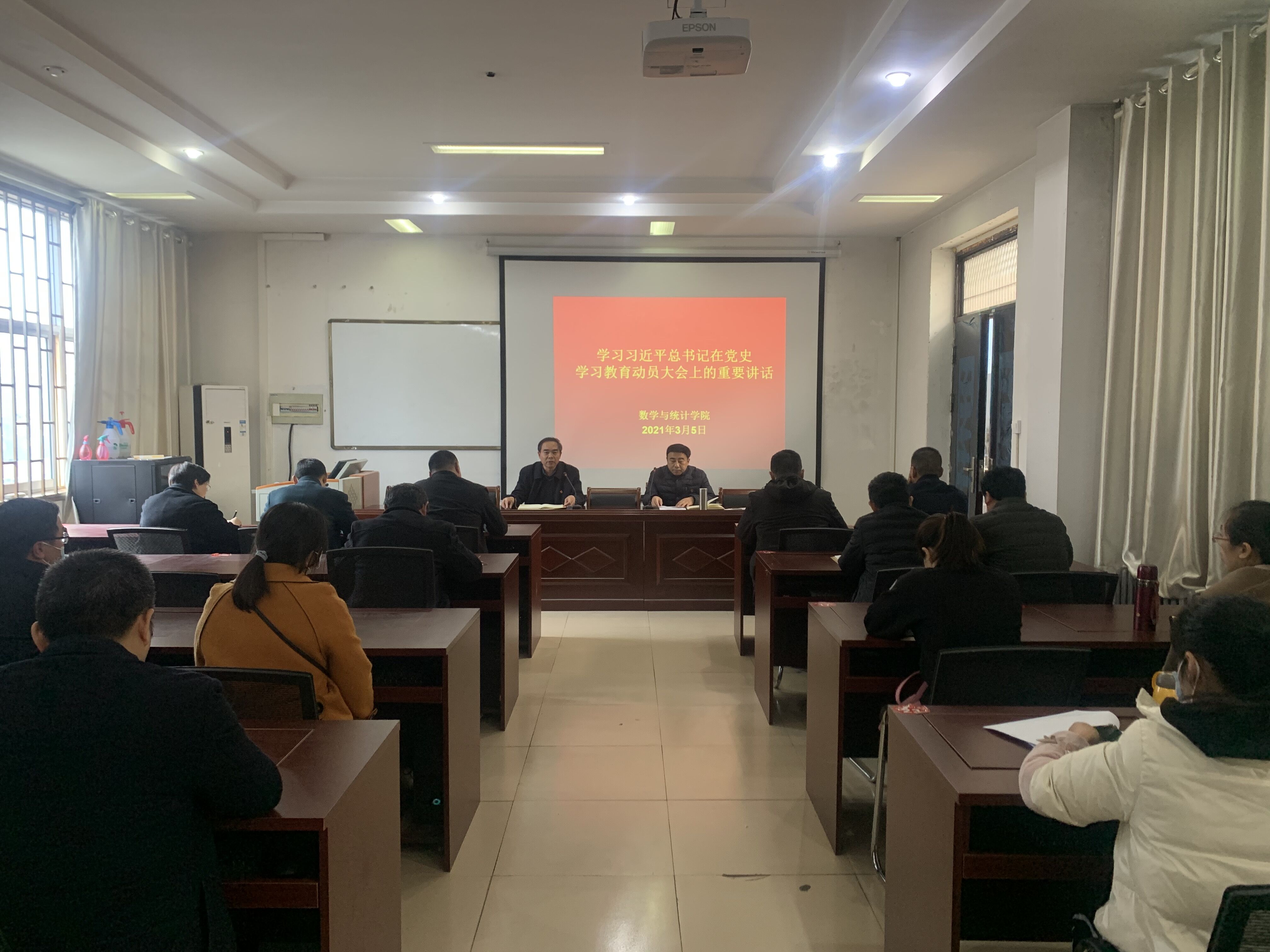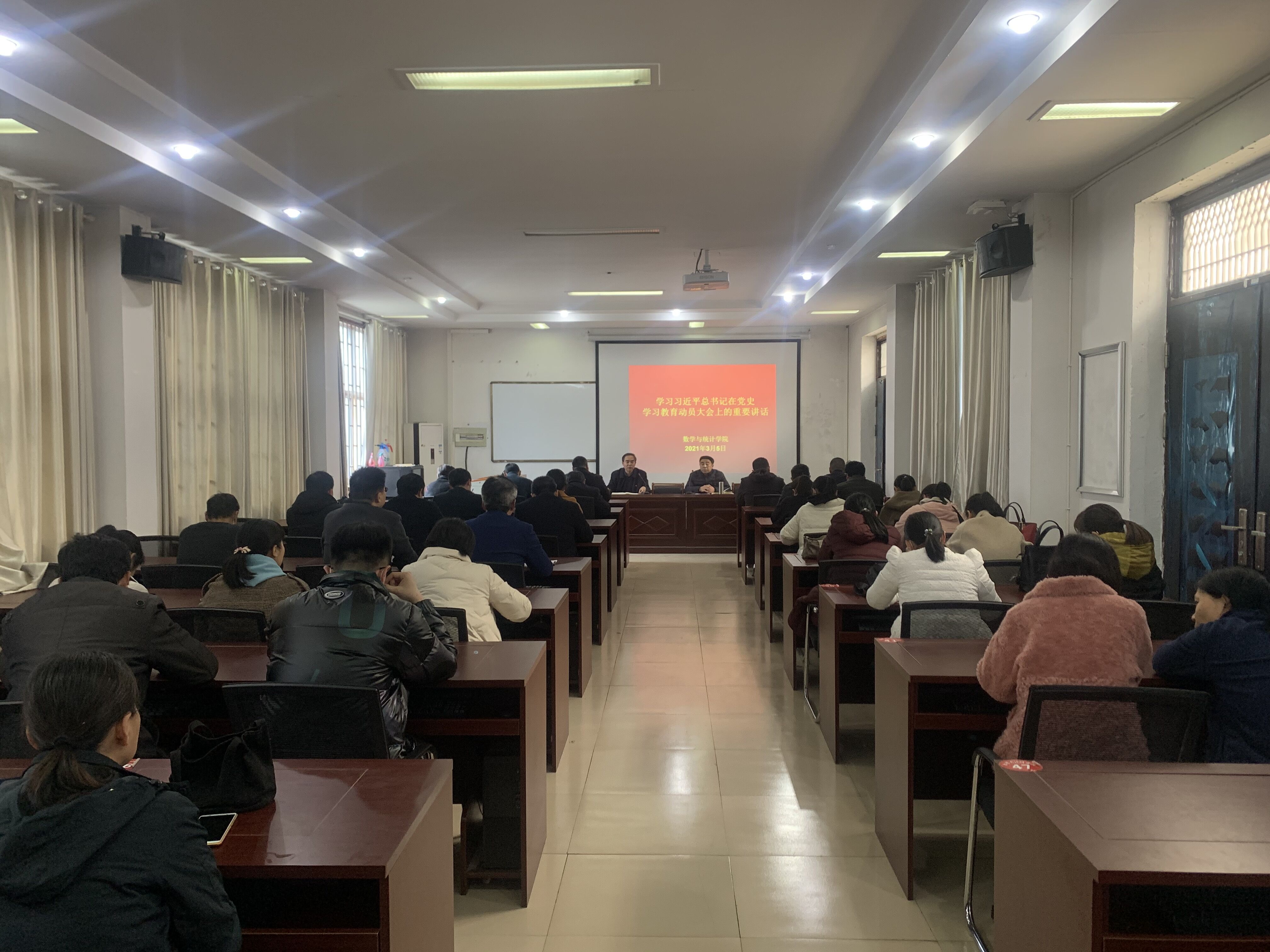2021年3月5日下午,beat365英国官网网站在数学楼综合会议室召开政治理论学习会议,学习习近平总书记在党史学习教育动员大会上的重要讲话和司林胜书记在我校党史教育动员大会上的讲话,安排部署学院的党史学习教育。学院领导班子、全体教职工参加此次会议,会议由院长梁洪亮主持。
