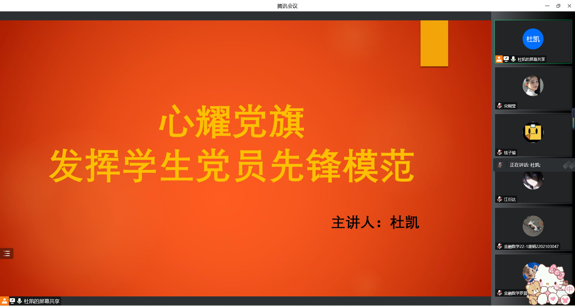 为积极引导学生党员发挥先锋模范作用,影响和带领广大同学共同进步,beat365英国官网网站于10月26日下午召开了以“心耀党旗,发挥学生党员先锋模范”为主题的线上党课培训。此次党课由学生第三党支部书记杜凯主讲,全体中级入党积极分子参加。