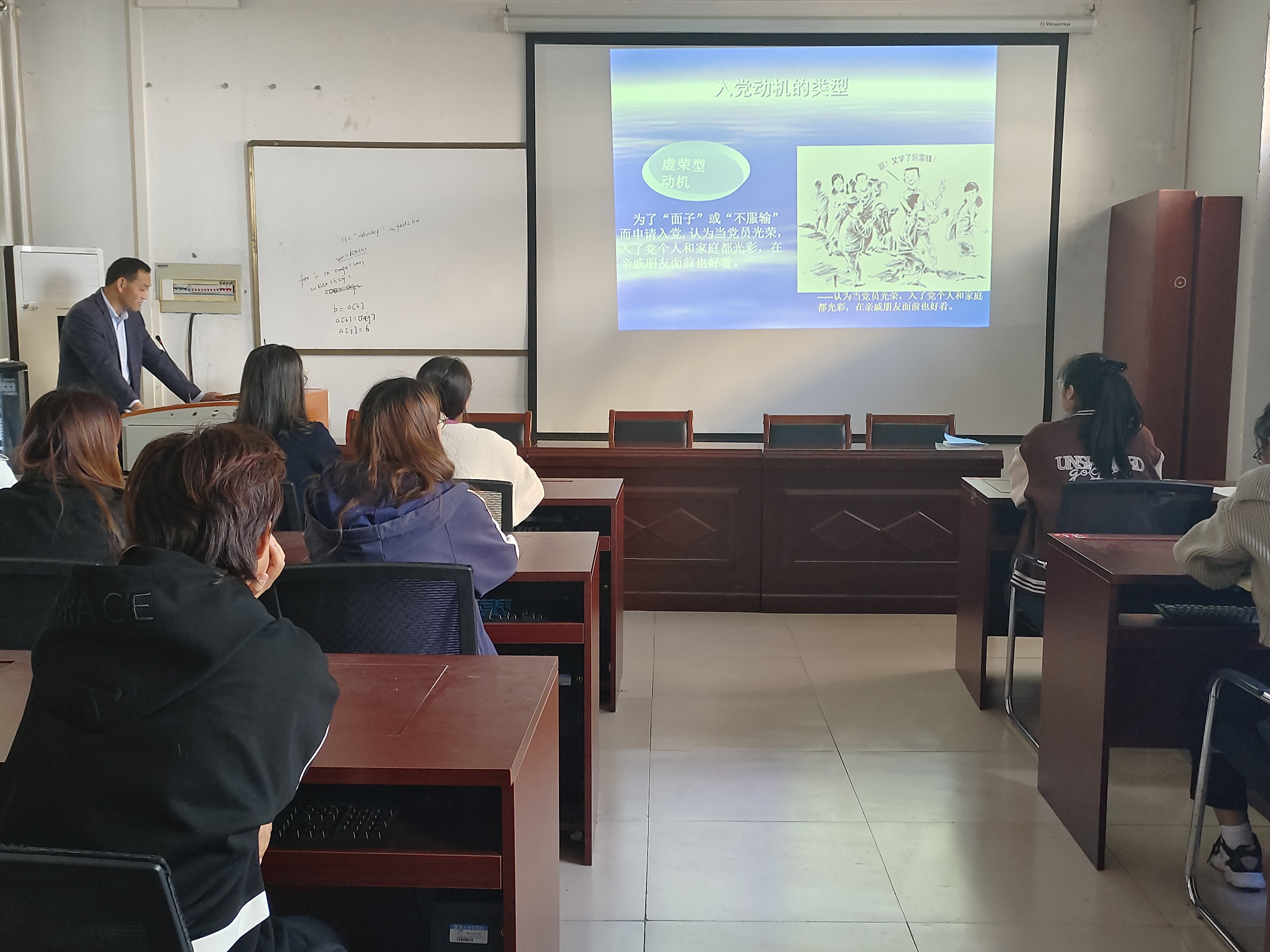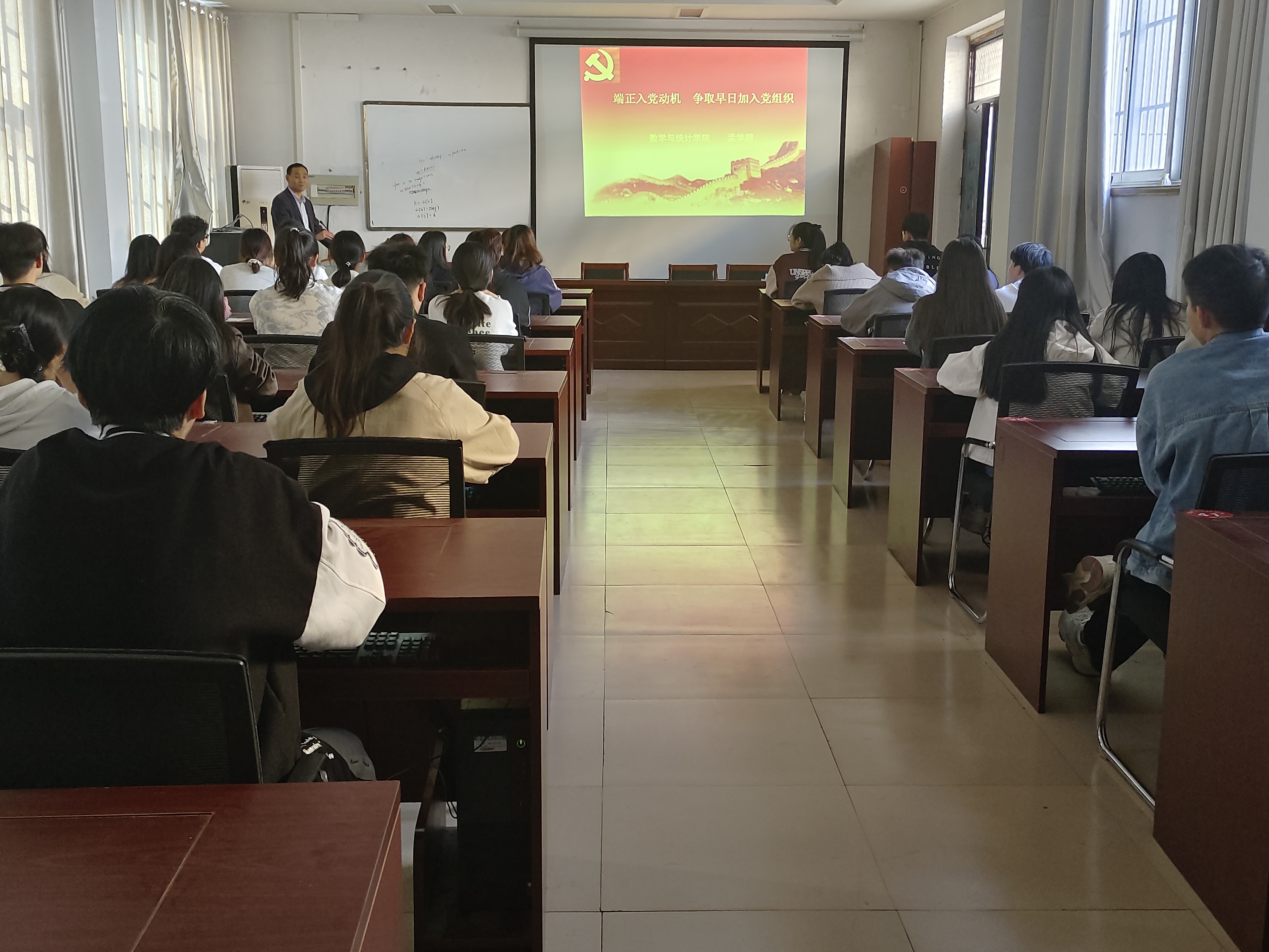 课上,孟学超书记从三个方面向同学们讲述党课内容,分别为端正入党动机是申请入党的前提和条件、思想道德修养是基础、接受组织考察是原则。首先,通过入党动机的表现形式展开介绍入党的前提和条件,又用“马斯洛需求层次理论”引入动机这个概念,向大家讲述了虚荣型动机、从众型动机等四种不同的入党动机类型,帮助入党积极分子端正入党动机。接着,孟书记结合实际,从正反两面举例强调青年应该具有积极向上的思想品德的重要性,要求入党积极分子提高自身修养,争做向上青年。最后,孟书记强调应积极向党组织靠拢,争做初心不改、牢记使命的当代大学生党员。