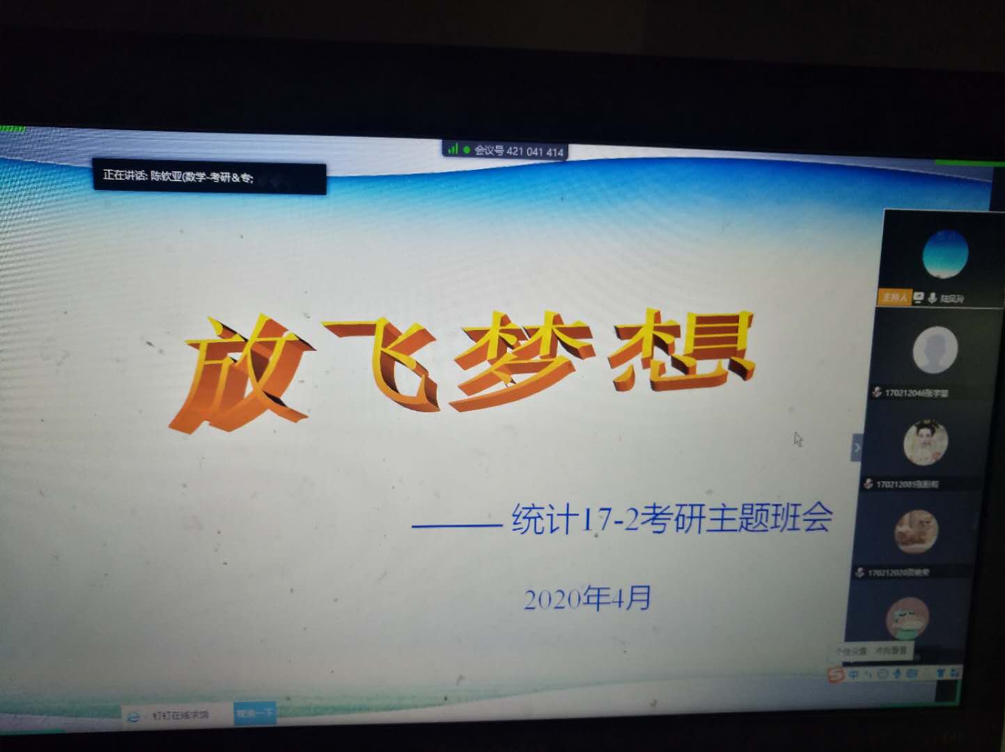 为了更好的帮助beat365官网学生规划学业生涯,明确努力方向,了解数学专业考研宏观形势及备考流程,beat365官网在3月底至4月初期间陆续为2017级应用数学、统计学专业学生开展了“放飞梦想”考研主题班会及问题答疑讲座,综合考虑到疫情给高校正常教学活动带来的影响,本次考研主题班会在线上进行。