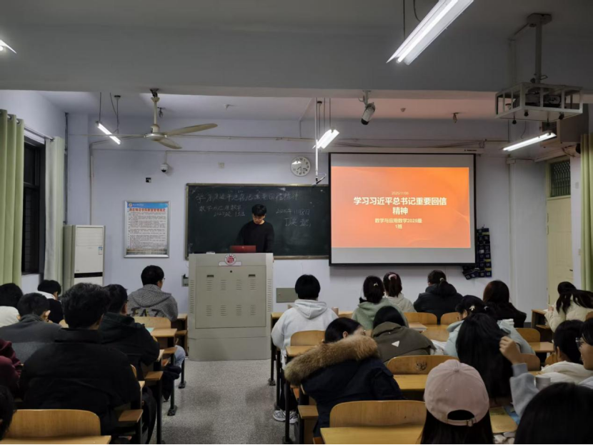 活动伊始,金融数学25级1班团支书赵明珠带领同学们学习习近平总书记重要回信原文,学习其内涵并阐释了习近平总书记对青年的殷切期望。随后,数学与应用数学25级2班团支书刘梦娜从践行重要讲话精神方面,引导同学们思考如何将回信精神转化为实际行动,鼓励大家积极投身志愿服务、西部计划等为建设祖国贡献自己的力量。最后,数学与应用数学25级1班团支书丁涣懿剖析回信精神的时代意义,结合强国复兴背景讲解青年责任与担当,启发同学们将个人理想与国家命运相连,在学思践悟中实现个人价值与国家需求同频共振。