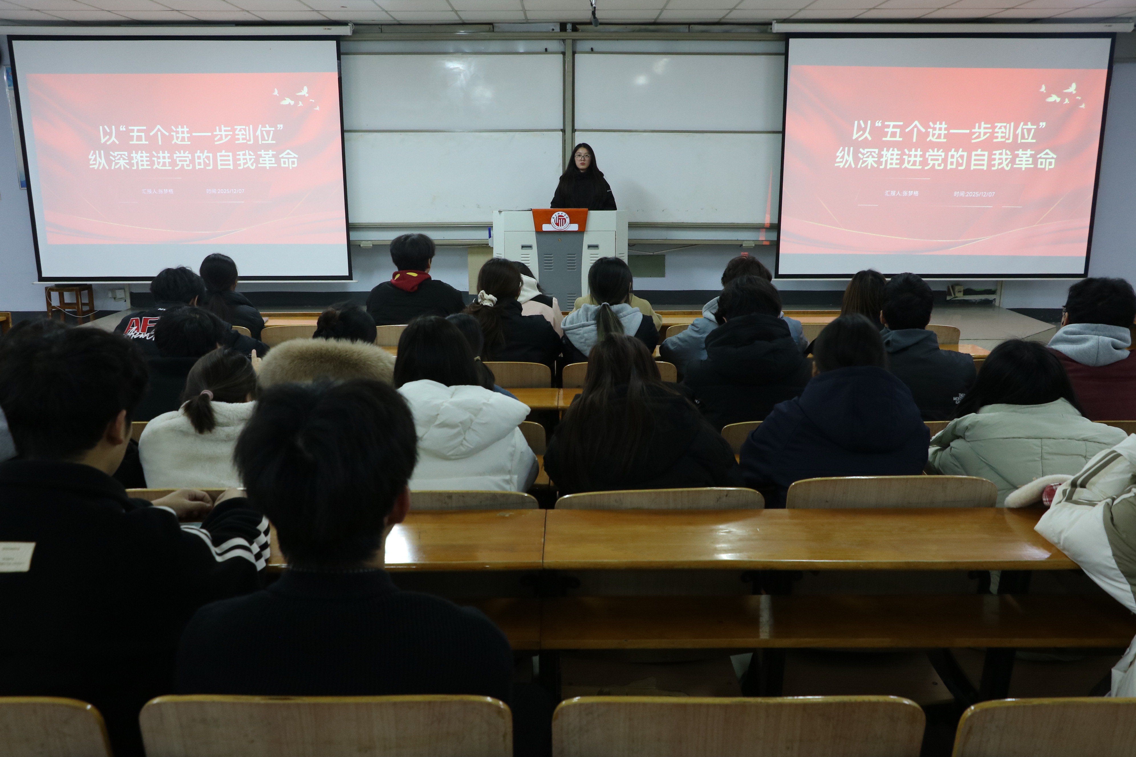 学习会上,张梦格同学围绕《求是》杂志发表的习近平总书记重要文章《推进党的自我革命要做到“五个进一步到位”》,系统展开领学。她从党的自我革命时代背景出发,深刻阐述了“时代呼唤自我革命”的内涵,剖析了自我革命在新时代全面从严治党中的紧迫性与重要意义。随后,她聚焦“认识与党性双到位”“权力监督全链条到位”等关键维度,梳理了自我革命的实践路径,并结合青年学生的使命担当,倡导大家将自我革新的意识融入日常学习与生活中,以实际行动践行青春责任。