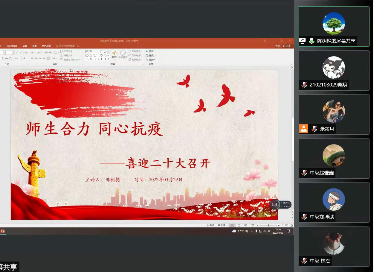 为提高党员党性观念和党性修养,进一步坚定理想信念,beat365英国官网网站于3月29日晚上七点线上以“师生合力 同心抗疫”为主题为中级入党积极分子上党课。本次党课由党委副书记陈树艳主讲,全体中级入党积极分子参加。