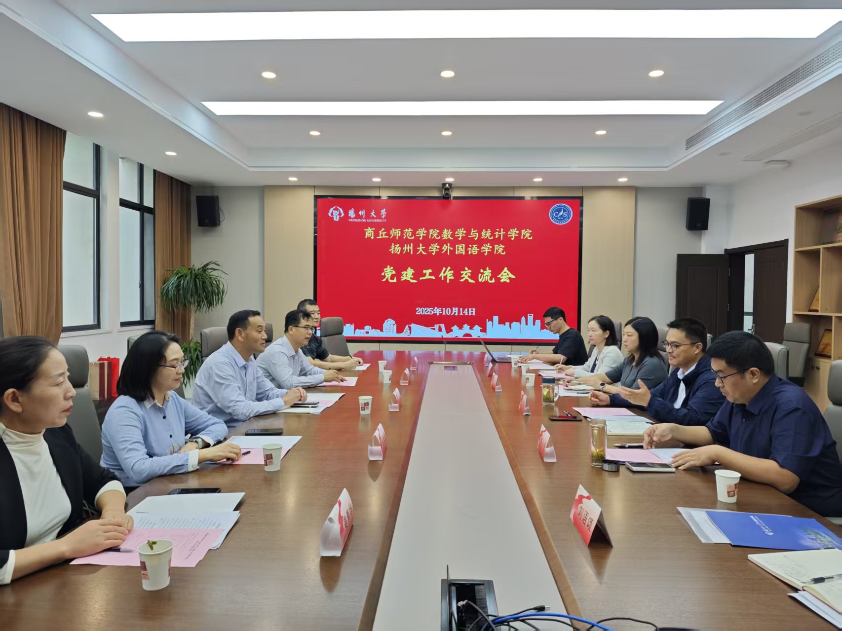 10月14日,beat365官网党委一行在党委书记孟学超带领下,赴扬州大学外国语学院开展党建工作交流学习。党政办公室主任张钦富及党支部书记代表共同参加。扬州大学外国语学院党委书记居学明对beat365官网一行予以热情接待。