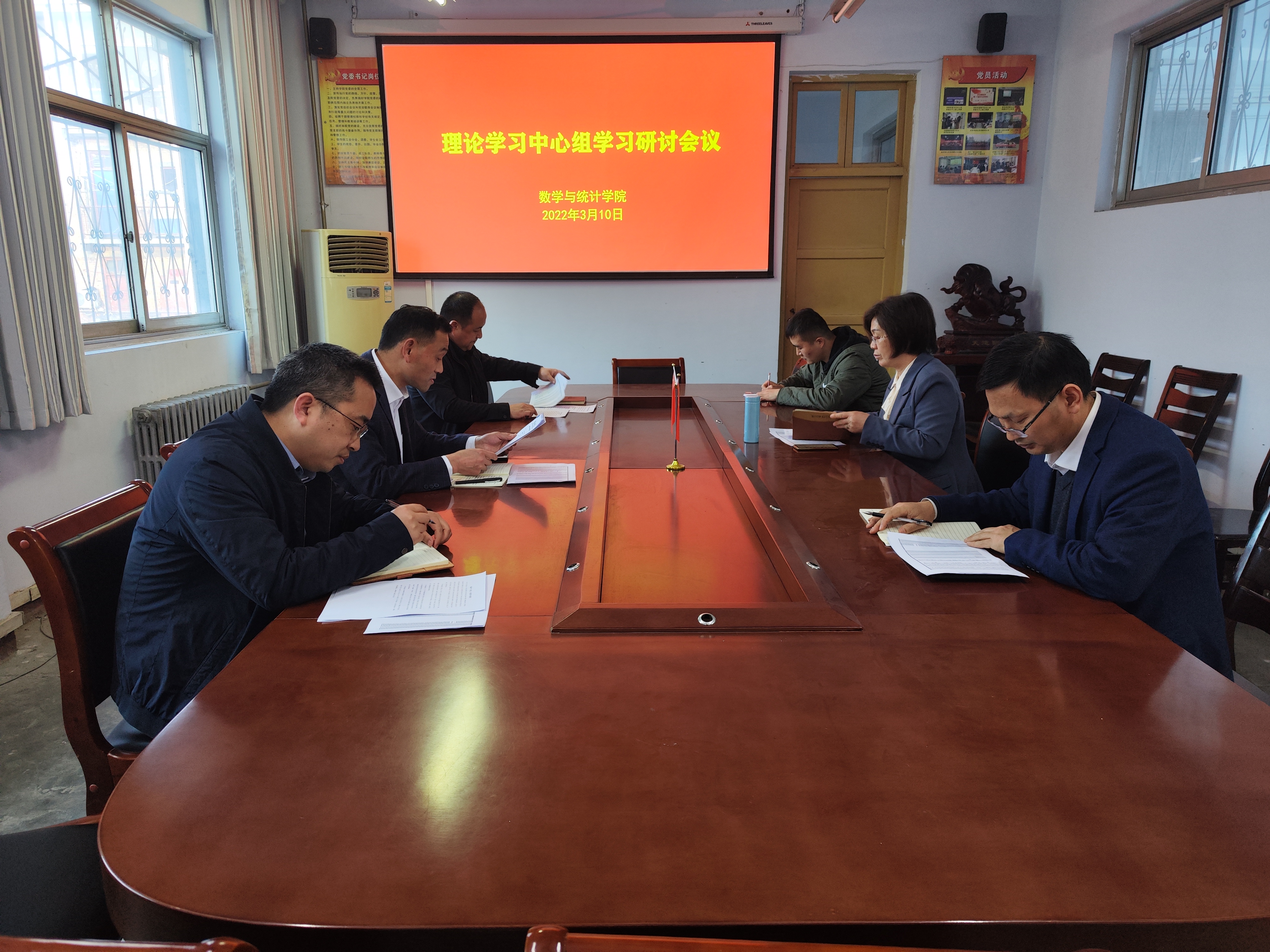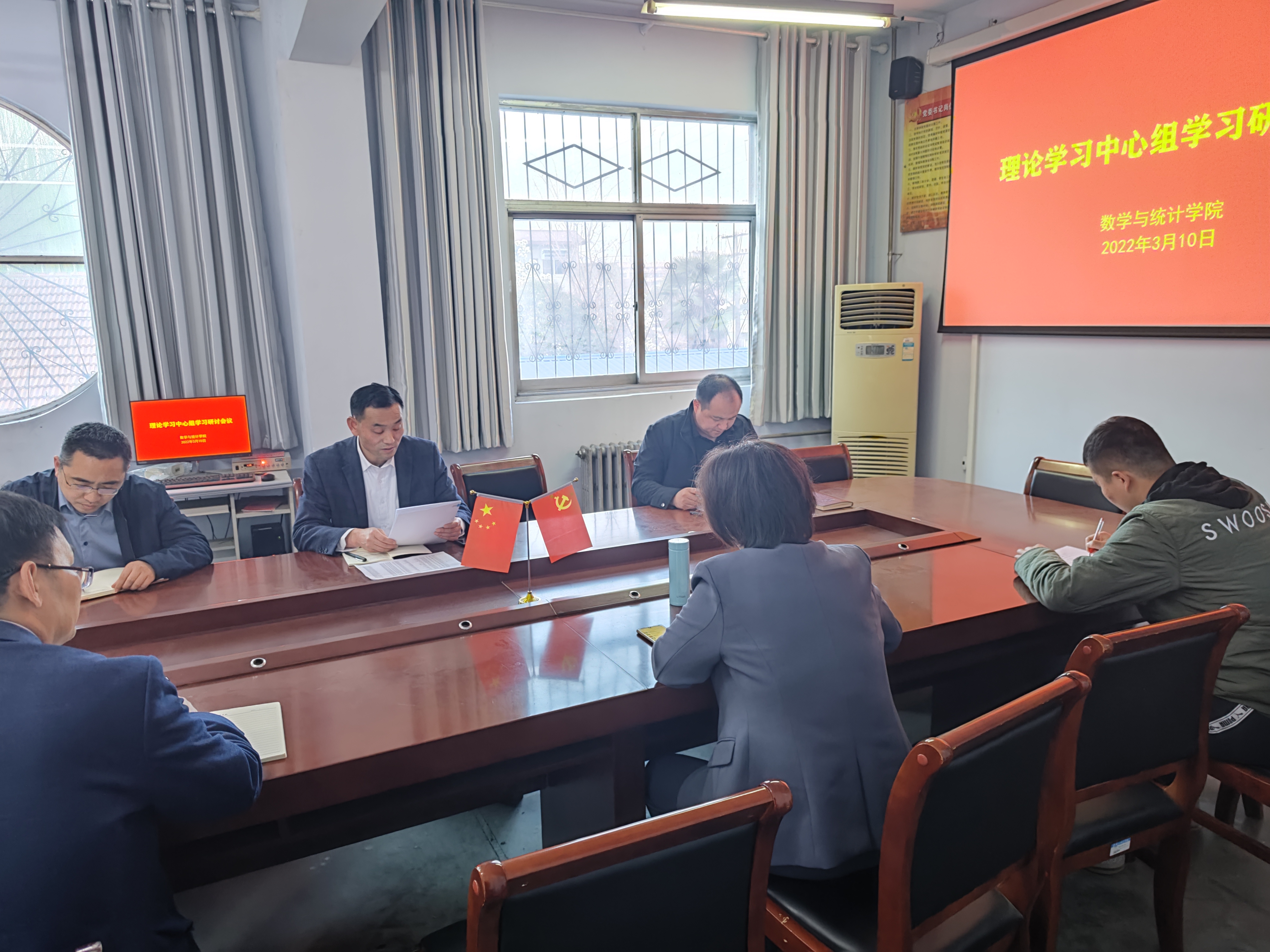 2022年3月10日,beat365英国官网网站在数学楼党员活动室召开党委理论学习中心组会议,学院党委委员一起参加了此次会议,会议由党委书记孟学超主持。