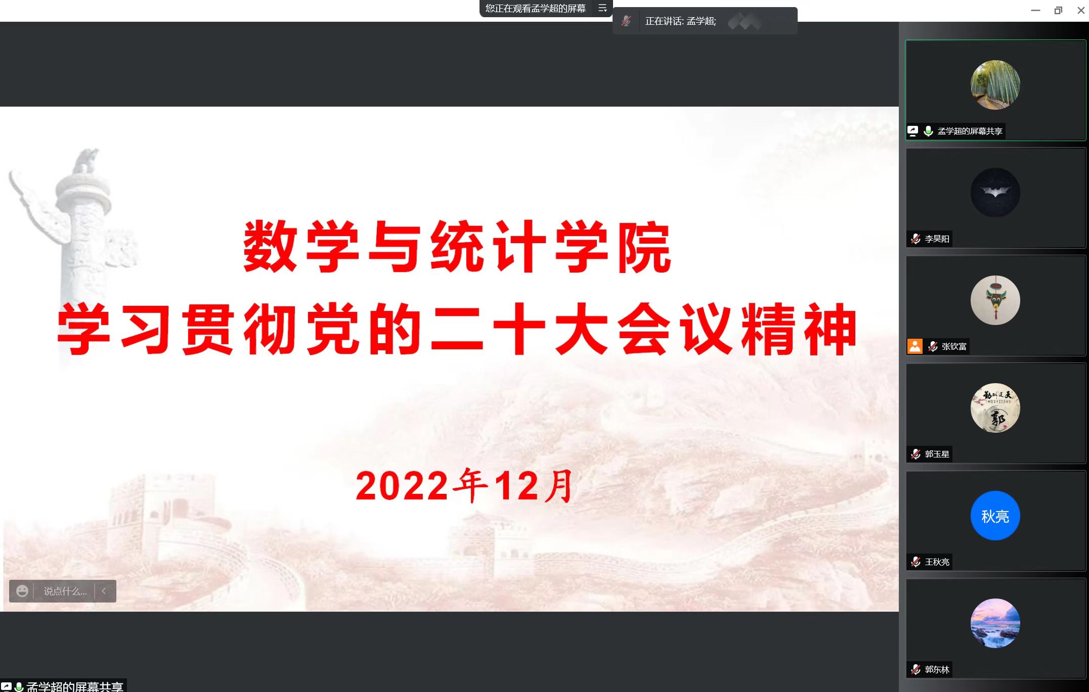 2022年12月2日,beat365英国官网网站召开全体教职工政治理论学习会议,学院领导班子、全体教职工通过腾讯会议在线上参加了此次会议,会议由院长张斐然主持。