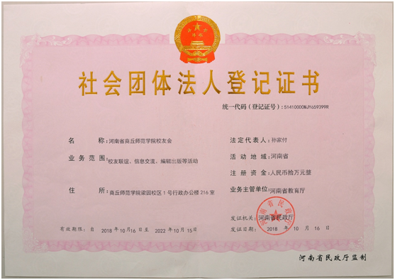 近日,河南省民政厅下发了关于成立“河南省商丘师范学院校友会” 行政许可的批复【豫民许准字(2018)95号】并向我校颁发了“河南省商丘师范学院校友会”社会团体法人登记证书,批准我校校友会正式成立。至此,历时数年的校友会注册工作圆满完成,我校校友会成为经河南省教育厅批准,由河南省民政厅注册登记、具有法人资格的合法社团组织。