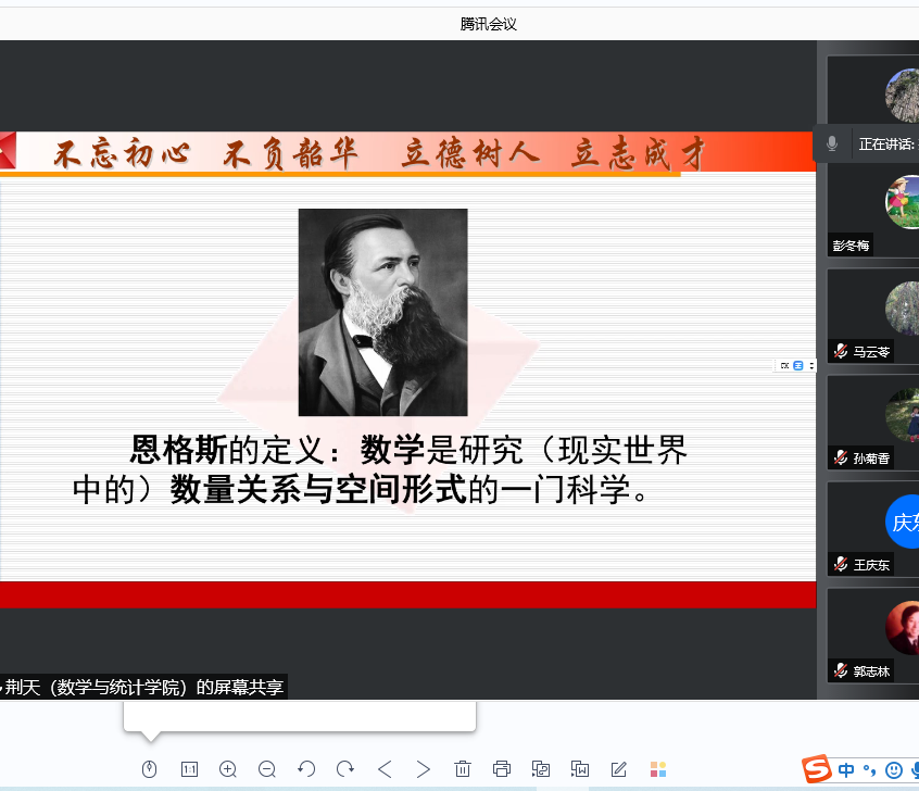 此次观摩活动内容是由荆天老师为大家分享的《数学史》课程中的一节课“什么是数学”,他详细的介绍了从引入到主要内容部分是如何思政元素引入的。从文科生的一首打油诗开始,展示许多学生对数学学习的苦恼,拉近与学生距离感。通过思想家、哲学家恩格斯谈对数学的认识,数学家罗素的思想对社会主义的影响,数学家华罗庚对数学的贡献等等,娓娓道来,使学生对数学有一个更深入的了解,树立学生的学科自信、文化自信、社会责任、民族自豪感。荆天老师匠心独酿,激情演绎,实现了知识传授与价值引领的统一,教书与育人的统一。